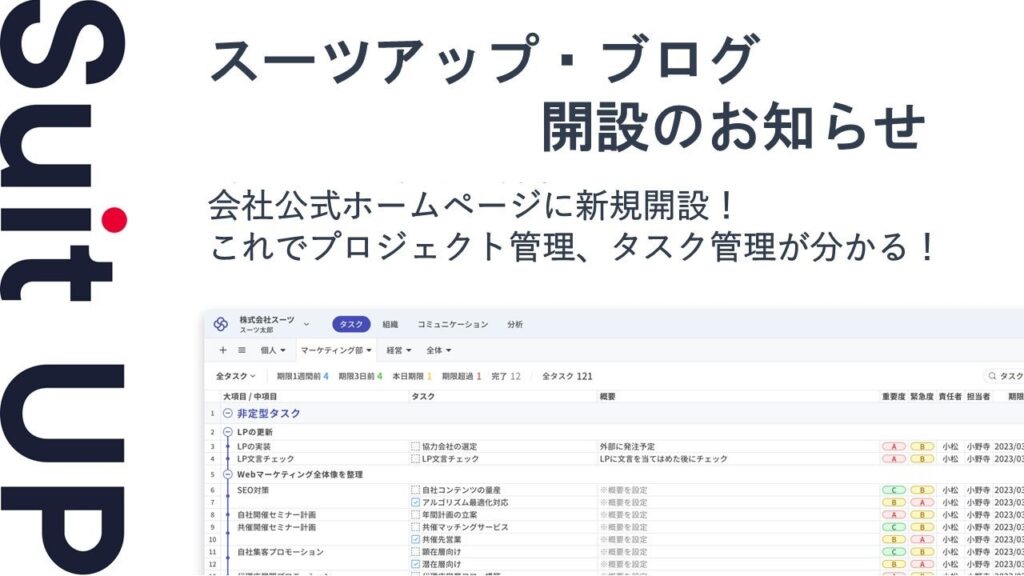 株式会社スーツ(東京都千代田区)は2026年2月17日10時10分、AIタスク管理・プロジェクト管理ツール「スーツアップ」に関する情報を発信する「スーツアップ・ブログ」を、会社公式ホームページ内に開設しました。ブログは8カテゴリーで構成します。