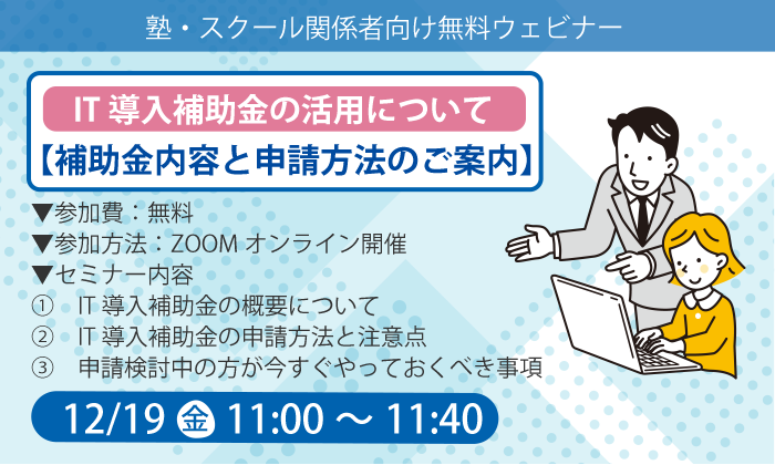 教育ソフト「天神」シリーズを手がける株式会社タオ(滋賀県草津市)は、2026年1月7日に最終公募締切を迎える「IT導入補助金2025」の活用方法を解説する無料オンライン説明会を、2025年12月19日(金)11時~11時40分に開催します。補助率は導入費用の最大3分の2で、学習塾や放課後等デイサービス、フリースクールなどのICT化を支援します。
