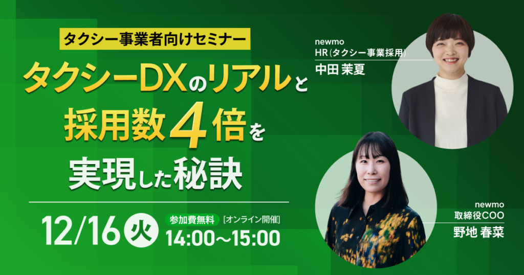 主催するのは、タクシー事業の変革に取り組むnewmo株式会社(東京都港区)。同社グループの取り組みは、2024年10月31日放送のテレビ東京系列「ガイアの夜明け『AIで激変!タクシー新時代』」でも紹介されました。セミナーでは、複数のタクシー会社をグループに迎えて進めているDX(デジタルトランスフォーメーション=デジタル技術による業務改革)の実際と、応募数・採用数を4倍に伸ばした人材戦略を具体的な数値や事例で説明します。