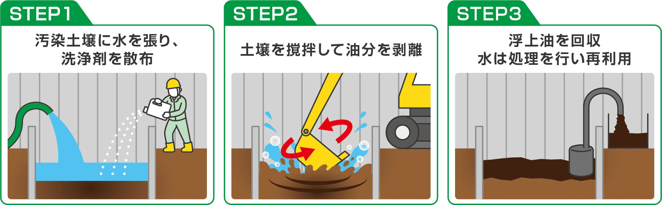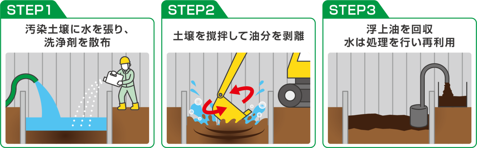 工法は、花王と共同開発した特殊な洗浄剤と水を汚染部分に注入し、重機で攪拌して油分を土から剥離・浮上させて回収する。使用水は活性炭で処理し、掘削して土を入れ替える「土壌入替方式」と比べてコストは約半減(地域差あり)とする。
