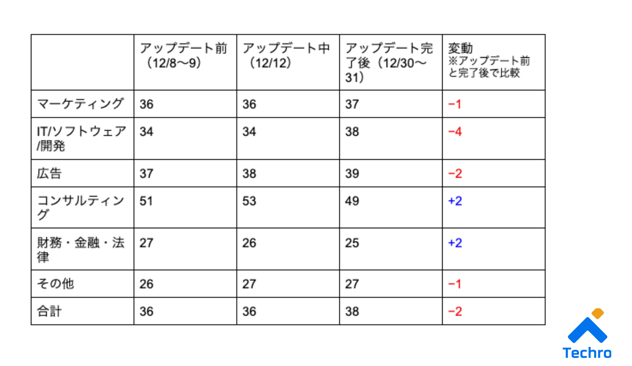 テクロ株式会社(東京都渋谷区)は2026年2月19日、2025年12月に発生したGoogleのコアアップデートについて、業界別の順位変動や下落・伸長サイトの特徴、発生時の対応策をまとめた分析記事を自社ブログで公開しました。一部サイトでは最大4位分の順位下落が確認されたとしています。