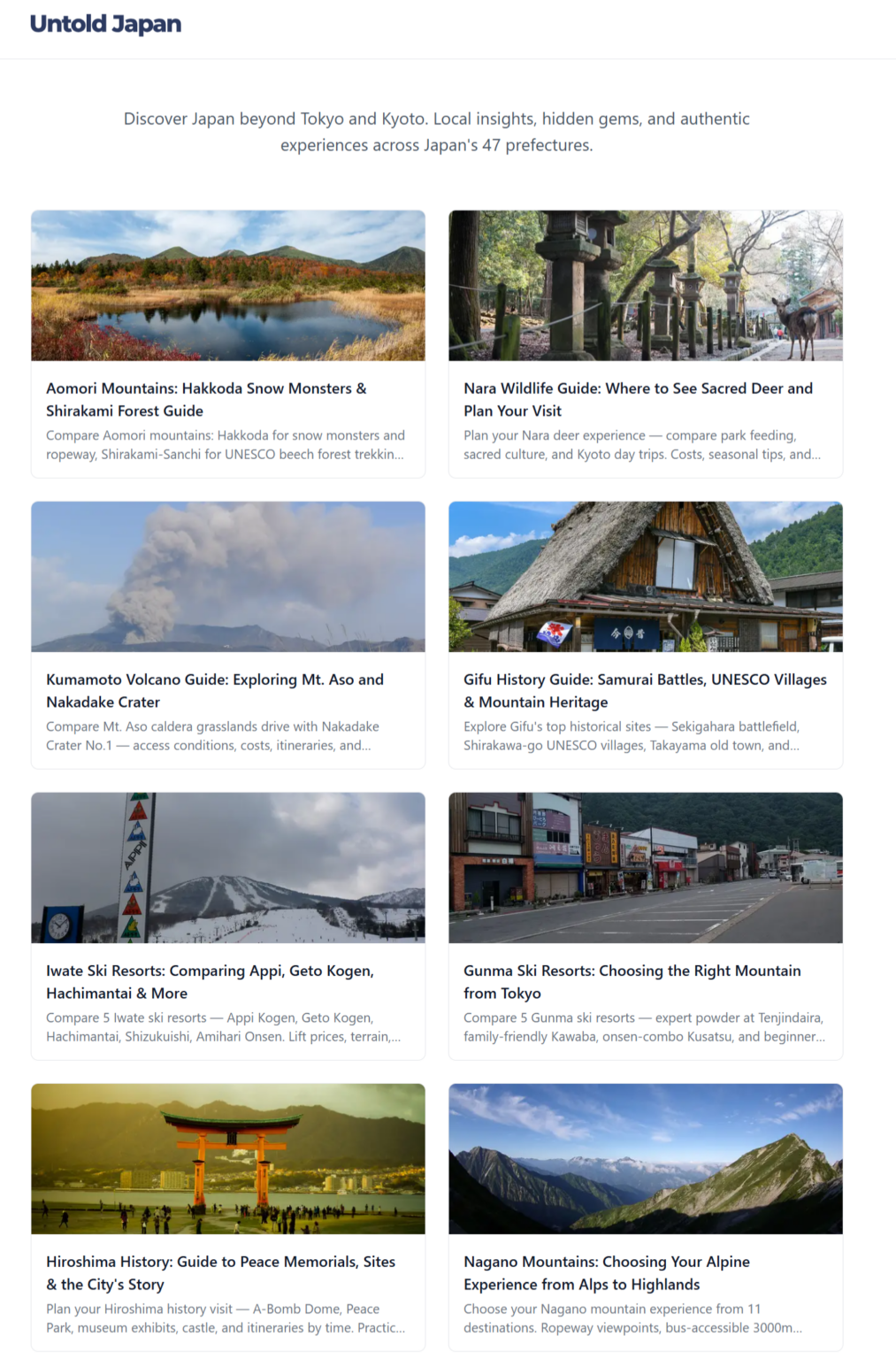 同サイトは「エリア(都道府県)」×「テーマ」の軸で、宿泊、グルメ、観光スポット、季節の楽しみ方などを探しやすく設計しています。地方の祭りや食文化、日帰りスポット、季節限定の体験も扱い、英語話者が地方の選択肢を比較しやすい導線を用意します。