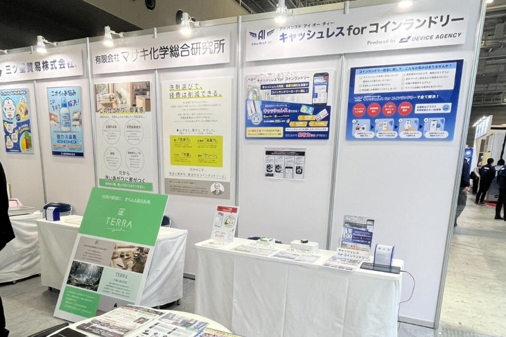 展示は一般社団法人日本コインランドリー連合会を協力法人に、三ツ星貿易、マサキ化学総合研究所と共同で実施しました。コインランドリー事業者や機器関連企業に向け、IoT端末の実機展示と機能説明、操作デモを行い、スマートフォンによるQRコード読み取りやNFCタッチによる決済体験を提供しました。