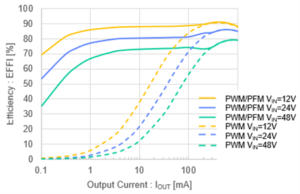 Nch-NchのドライバFET内蔵で、スイッチング周波数は800kHz。MODE端子でPWM(周波数一定でノイズ対策が容易)とPWM/PFM(軽負荷域も含め高効率)を選べる。外付け抵抗で出力2.5~18.0Vに設定でき、同一品番の電源共用も想定する。ソリューションサイズは10.8×8.2mmで、待機電力低減や中高耐圧LDO置き換えによる発熱・基板面積の課題に対応する。工場のFAセンサやビル設備のセキュリティ機器など、24V系産業機器で小型・高耐圧電源需要の広がりが見込まれる。