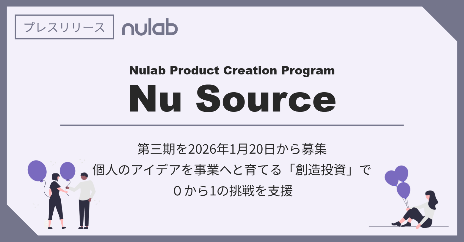 ヌーラボは2026年1月20日、個人の事業アイデアを起点にプロトタイプ開発から事業化まで支援するプログラム「Nu Source」第3期の募集を同日から3月13日まで実施すると発表しました。対象は職種やスキルを問わず、採択後は業務委託契約を結び業務委託費と研究開発費を支払う仕組みで、資金面の不安を軽減して開発に集中できる環境を用意します。