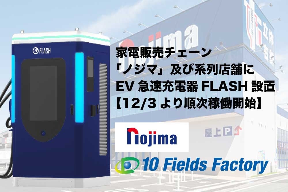 テンフィールズファクトリーは、家電量販店チェーンのノジマが運営する店舗・系列施設の計3拠点に、EV急速充電器「FLASH」を設置し、順次稼働を始めます。12月3日に「ままともプラザ町田駐車場」と「ノジマ相模原本店」で稼働し、「東戸塚西口プラザ」は2026年1月以降の稼働予定です。買い物動線上での充電機会を増やし、来店客や地域のEV利用者の利便性向上と環境負荷の軽減を狙います。