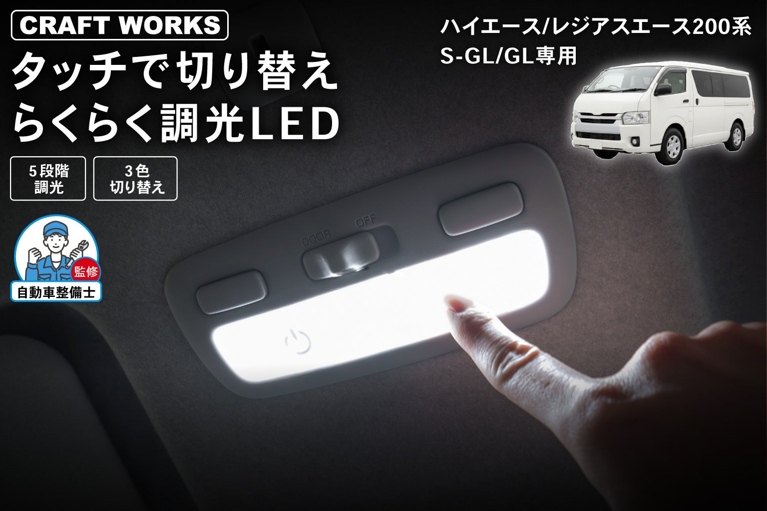 Fun Standard(福岡県大野城市)は2026年3月、車アクセサリブランド「CRAFTWORKS」から、ハイエース/レジアスエース200系のS-GL/GL専用タッチ式LEDルームランプを発売します。色味はホワイト・アンバー・電球色の3色、明るさは5段階で、参考販売価格は7,480円〜です(販売先や時期で変動)。