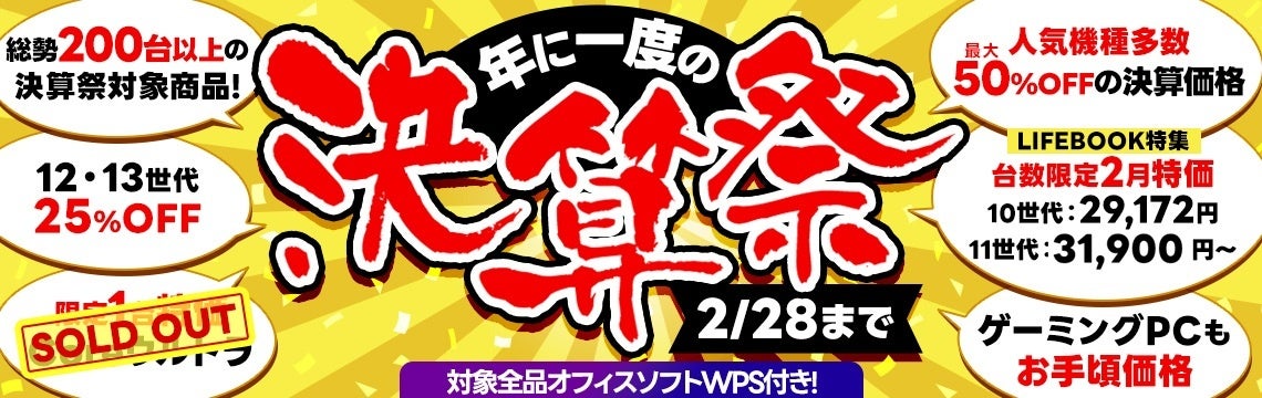 株式会社バルテックのグループ会社で、PCバルを運営する株式会社バルテックフィールドサービスは、中古パソコン販売サイト「PCバル」で「年に一度の決算祭」セールを2月28日まで実施します。対象商品は200台規模で、最大50%OFFに加え、オフィスソフトWPSを付けます(対象商品)。