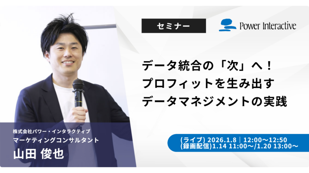 マーケティング支援を行う株式会社パワー・インタラクティブは、データ統合後の収益向上に焦点を当てた無料ウェビナー「データ統合の『次』へ!プロフィットを生み出すデータマネジメントの実践」を、2026年1月8日・14日・20日の3回にわたりオンラインで実施します。受講料は無料で、1回あたり約50分のプログラムです。