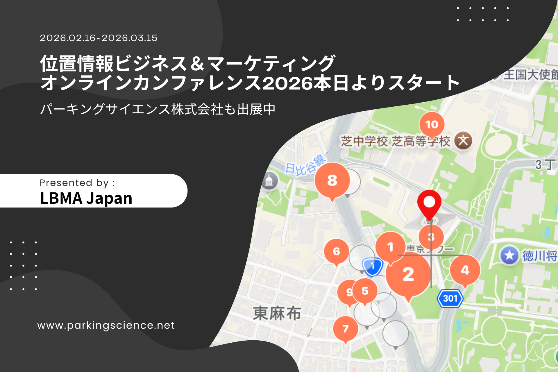 神奈川県藤沢市のパーキングサイエンスは、LBMA Japan主催の「位置情報ビジネス&マーケティング オンラインカンファレンス2026」に参加し、駐車場検索アプリ「P-Collection」などの事業紹介と、オーバーツーリズム課題の解決に向けた取り組みを動画で紹介します。開催期間は2026年2月16日~3月15日で、会場はオンラインです。