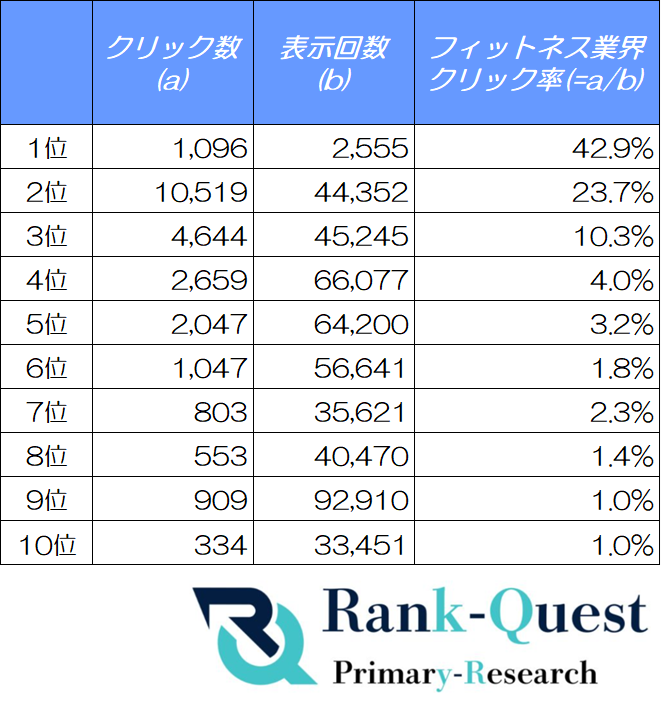 フィットネス業界の検索結果で1位表示されたページのクリック率(CTR)は42.9%となり、2位23.7%、3位10.3%と続くことが2025年10月のデータで分かりました。4位は4.0%、5位は3.2%、6位以下は1〜2%台、8〜10位は1.0%前後にとどまり、検索結果の上位3位が集客の大半を占めている実態が数字で示されています。