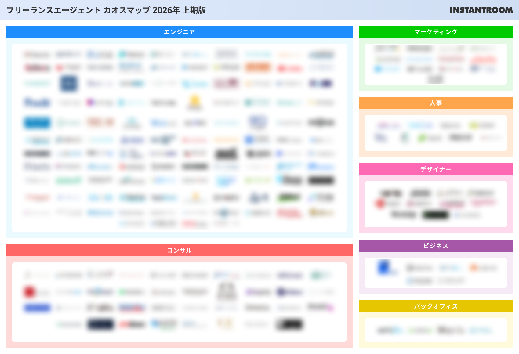 INSTANTROOM(東京都渋谷区元代々木町25-6)が運営する案件検索サイト「フリーランスボード」は1月23日、フリーランスエージェント195社を7領域に分類した「【2026年上期版】フリーランスエージェントカオスマップ」を公開し、閲覧ページで無料配布を始めました。