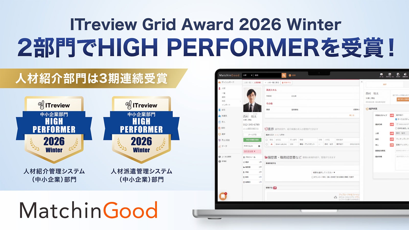 MatchinGoodは、求人・求職者情報から契約、売上までを一元管理するクラウド型の業務管理システムです。なお「人材紹介管理システム(中小企業)」部門での受賞は3期連続としています。