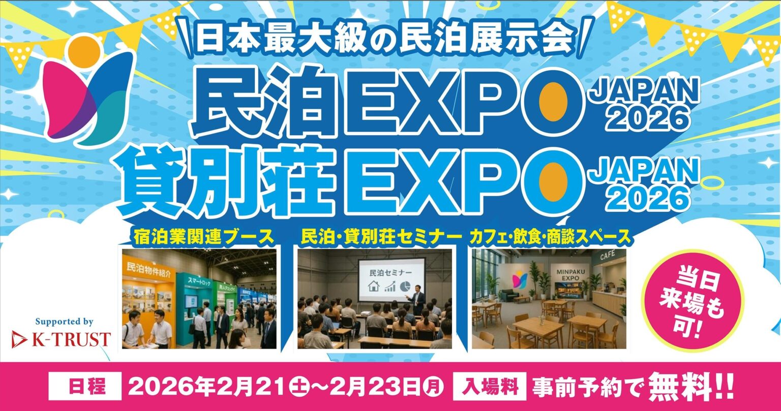 ブロードエンタープライズ(大阪市)は、2026年2月21日〜23日に幕張メッセ展示ホール6で開かれる「民泊EXPO JAPAN 2026」で、セミナー全般のメインスポンサーを務めます。会期中はブース出展に加え、民泊コンテスト「BEST OF MINPAKU」の審査員としても参加します。イベントは事前申込で参加無料です。