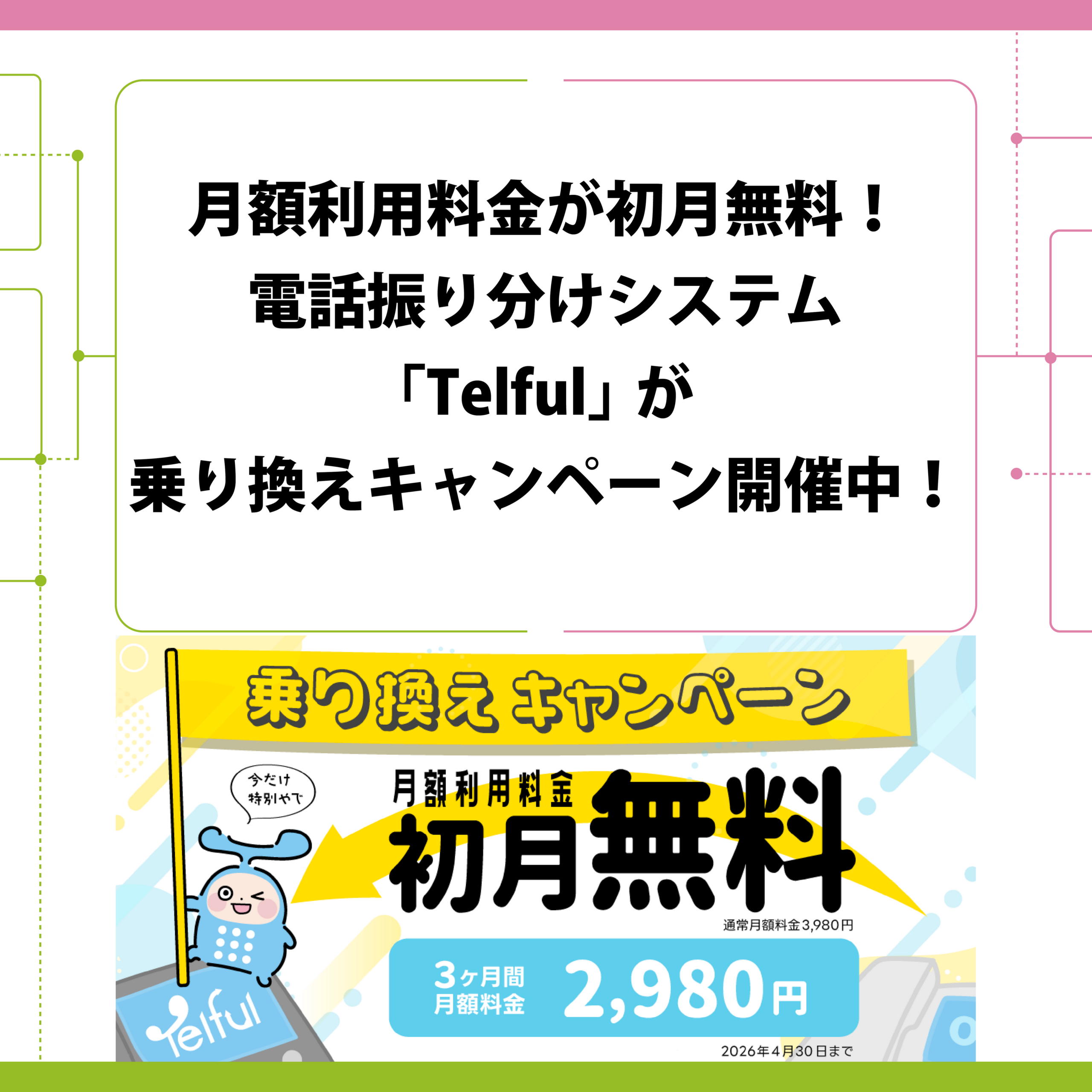 株式会社プロディライト(大阪市中央区)は、電話振り分けシステム「Telful(テルフル) powered by INNOVERA」で、他社の電話サービス利用者を対象に、初月の月額利用料を無料、以後3カ月を月額2,980円(税抜)とする乗り換えキャンペーンを2026年1月16日〜4月30日に実施します。通常料金は月額3,980円(税抜)です。対象は期間中の新規契約で、申込時点で他社サービス利用中であることを示す開通通知書や請求書、管理画面の画像などの提出が必要です。Telfulは、ボタン操作や営業時間、電話番号などの条件で着信を振り分け、応対品質を保ちながら電話業務の負担軽減と業務効率化を支援します。設備導入不要で、利用中の電話番号を継続できる点も特徴です。申し込みは専用フォームから行い、備考欄に「乗り換えキャンペーン適用希望」と記入します。特典は予告なく変更・終了する可能性があり、不適切な申し込みが確認された場合は特典が取り消されることがあります。今後は、電話対応の効率化ニーズを背景に、既存電話サービスからの移行促進がどこまで進むかが焦点となります。