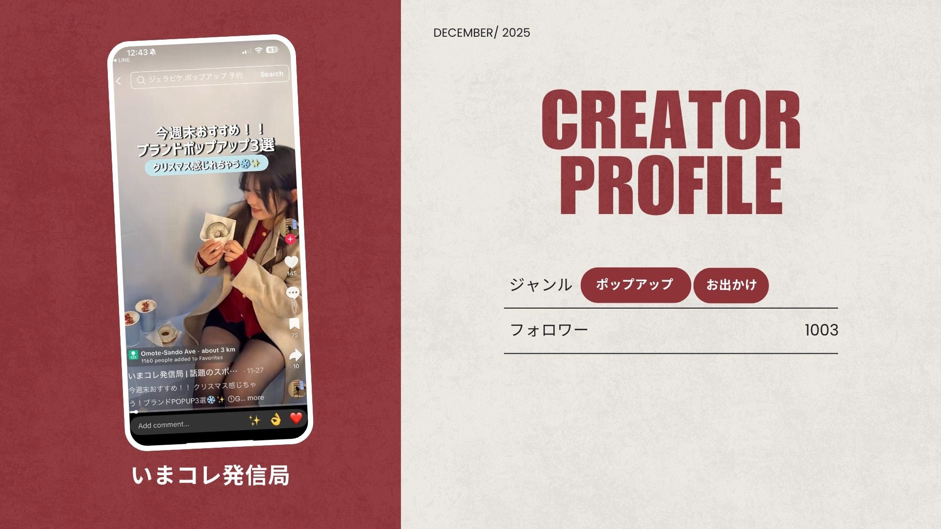 ベクトルは2025年12月17日、取材から配信までを担うショート動画メディアネットワーク「ショート動画取材班」に、ポップアップ・お出かけ情報を扱うTikTokアカウント「いまコレ発信局」が新たに加わったと発表しました。同アカウントはフォロワー1003人で、過去投稿には再生回数25万回超の動画もあるといいます。加盟により、企業やブランドのポップアップイベントを中心としたSNS上での認知拡大や集客面での効果が見込まれます。「ショート動画取材班」は、美容・トレンド・お出かけなど多ジャンルのクリエイターが現地取材し、縦型の短尺動画で発信する仕組みです。複数アカウントでの同時拡散に加え、リーチ保証型で拡散力を担保し、最短即日掲載のスピードで情報露出を後押しするとしています。今後は、イベント需要が高まる時期に合わせ、取材網の拡充がSNS施策の選択肢を広げる可能性があります。