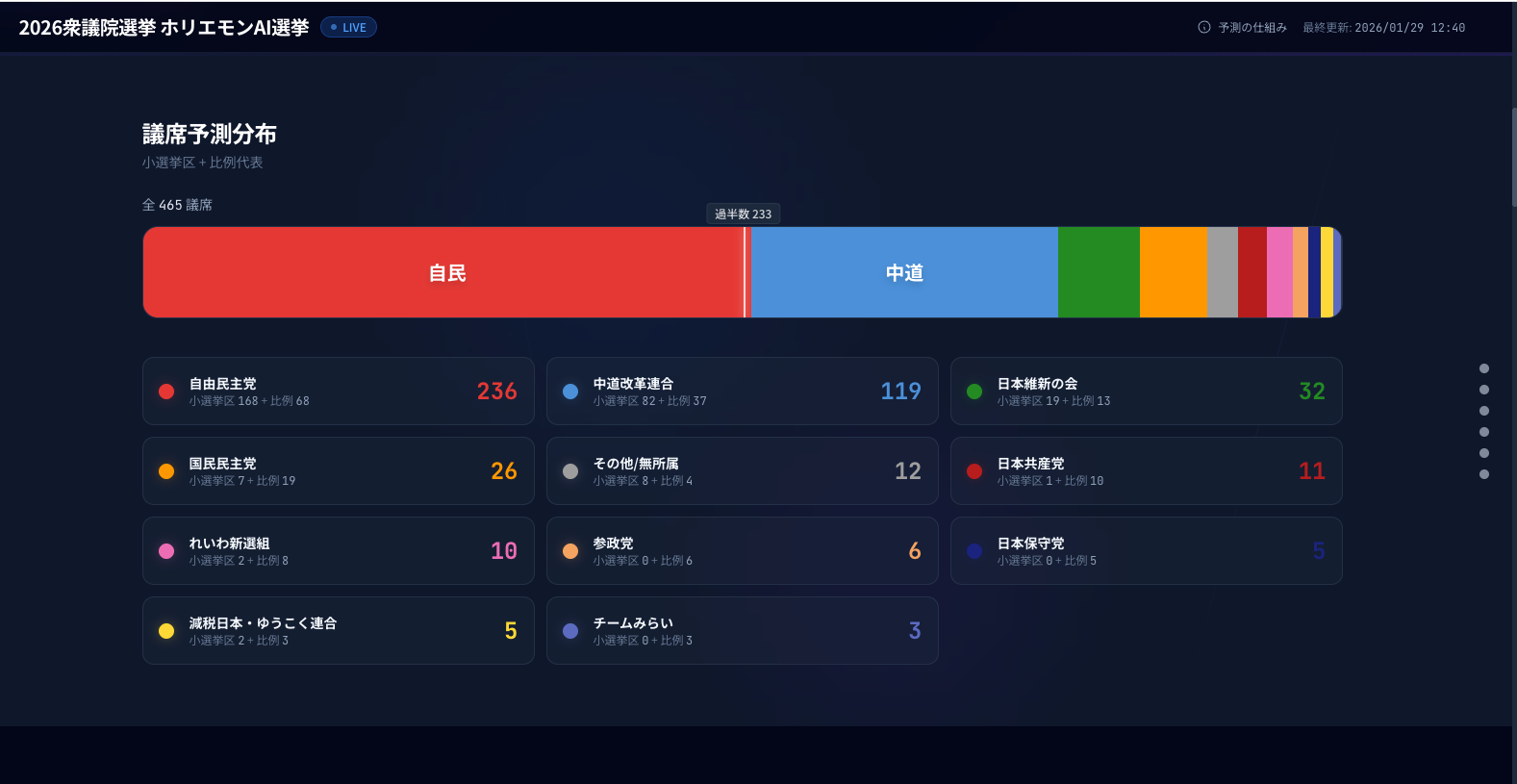 ホリエモンAI学校株式会社(東京都新宿区)は2026年実施予定の衆議院議員総選挙に向け、公開中の「ホリエモンAI選挙」で用いるAI予想の仕組みを開示しました。予測は1日3回、自動で更新するとしています。