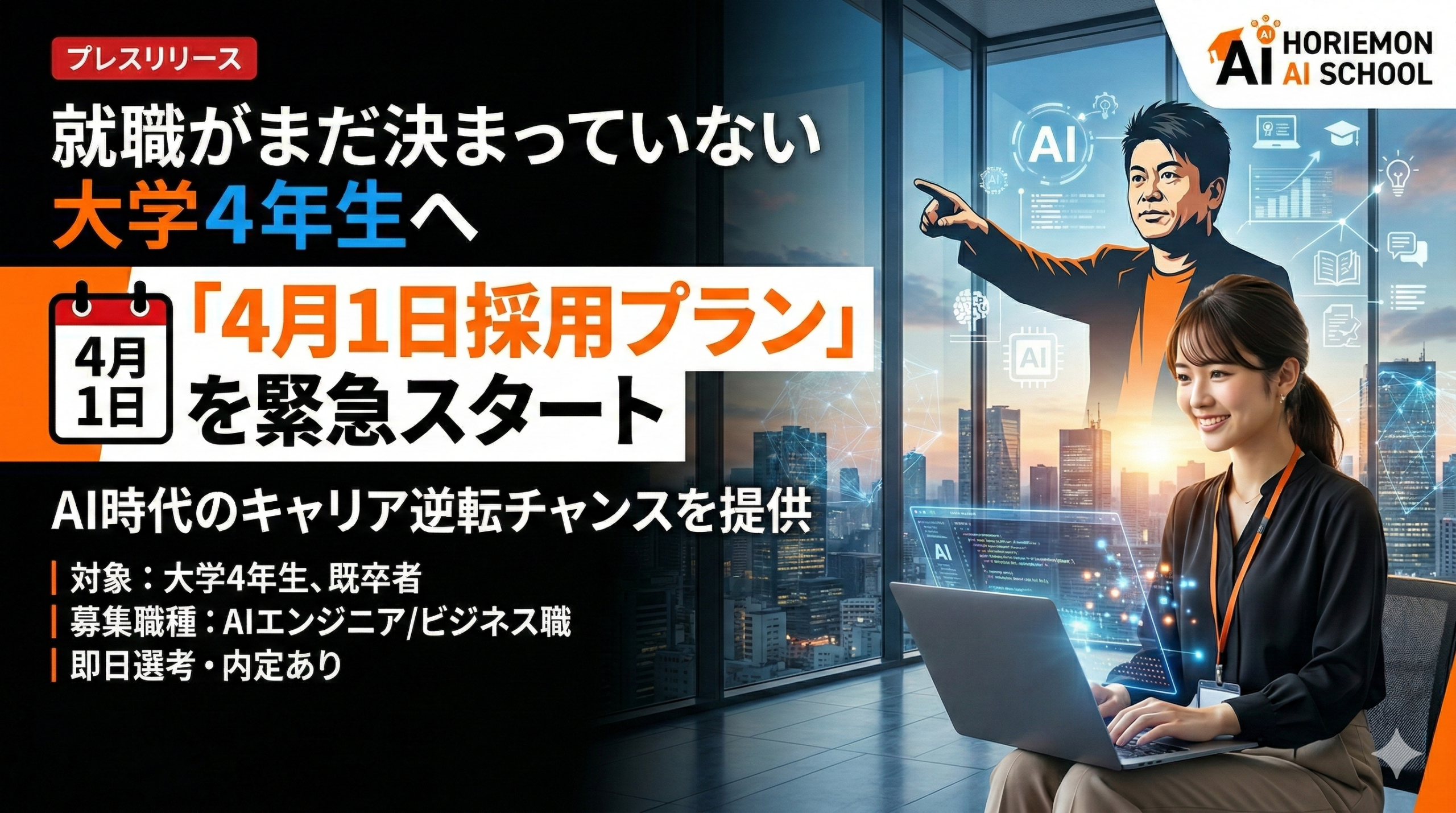 ホリエモンAI学校株式会社(東京都新宿区)は2026年3月4日、就職先がまだ決まっていない大学4年生を対象に、入社日を2026年4月1日とする「4月1日営業採用プラン」を緊急に開始しました。募集人数は若干名で、初任給に当たる年収は300万円からとしています。