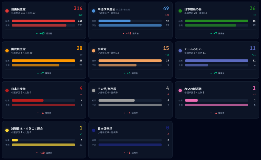 想定外の結果に。2026衆議院選挙AI予想『ホリエモンAI選挙』、小選挙区的中率は72%、自民が予想より+43議席、中道が予想より-48議席