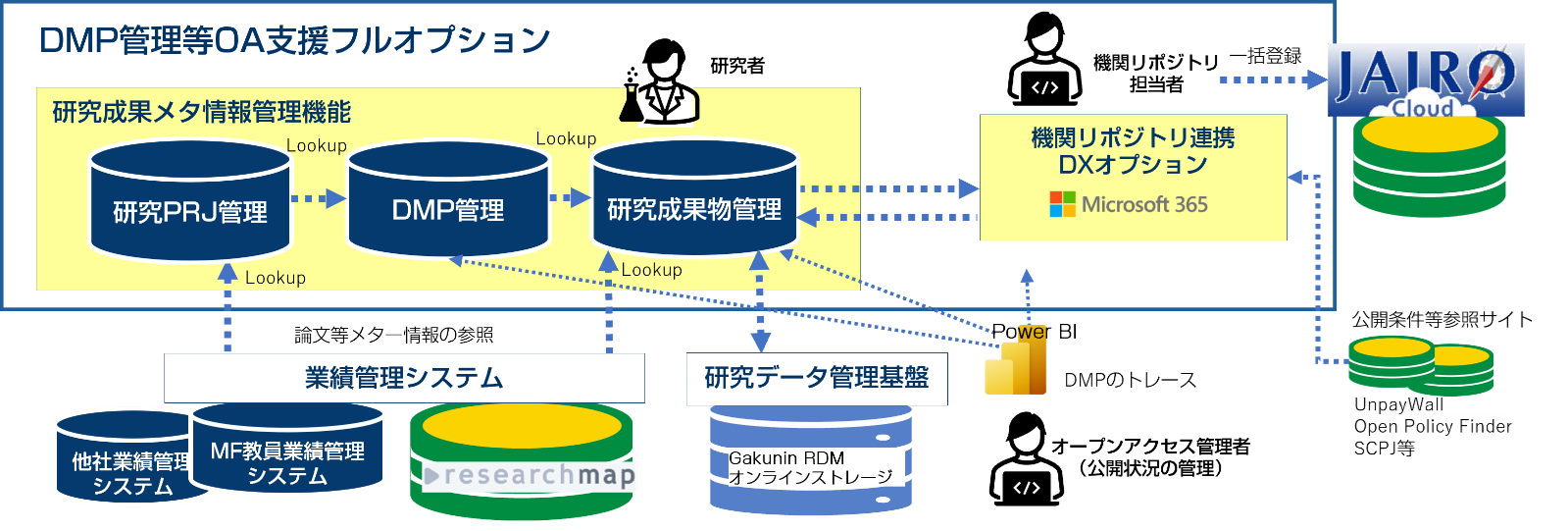 製品:MFオープンアクセス支援システム(A. 機関リポジトリ連携DXオプション/B. DMP管理等OA支援フルオプション/C. researchmap対応機関リポジトリ連携DXシステム)