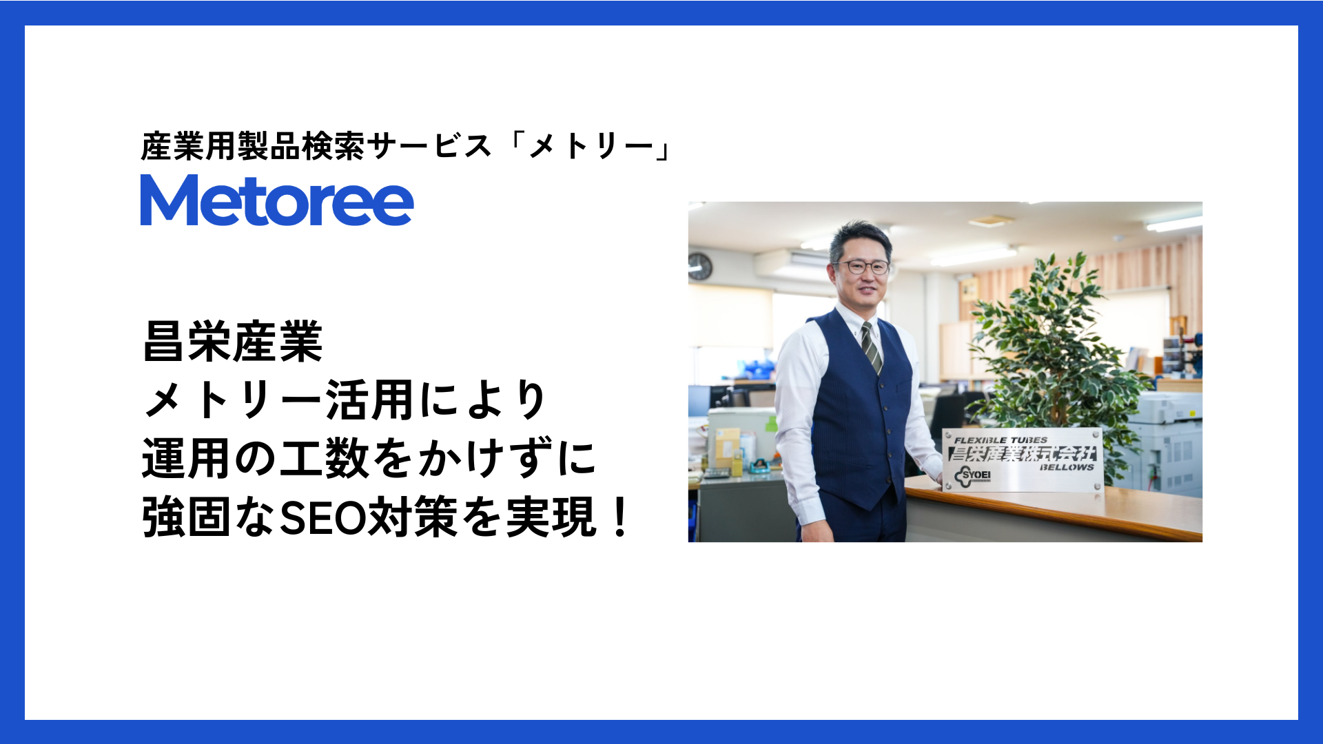産業用製品検索サービス「メトリー」の活用により、フレキシブルチューブを製造する昌栄産業のホームページ経由の問い合わせが月0件から月10件へ増加しました。自社で大きな工数を投じずにSEOの強化を実現し、検索結果での露出が改善。新規業界からの引き合いや、商社を介さない直接案件も増えたとされています。