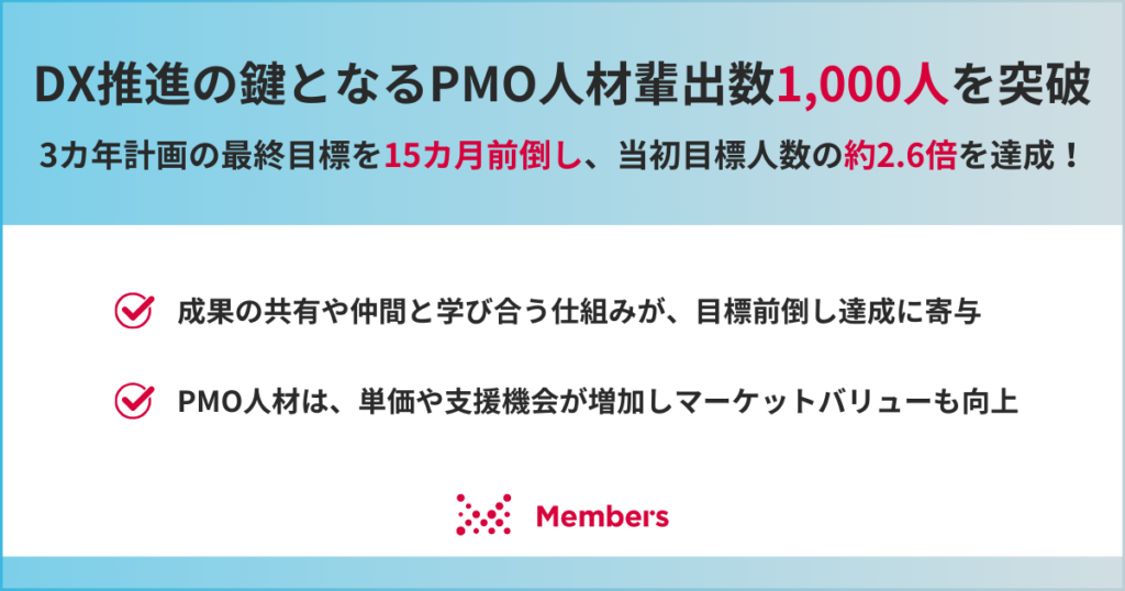 株式会社メンバーズ(東京都中央区)は、PMO(プロジェクト・マネジメント・オフィス)人材の累計輩出数が2025年12月時点で1,000人を超えたとした。2027年3月末までに385人を輩出する3カ年計画の最終目標を、15カ月前倒しで達成し、当初目標比で約2.6倍に到達したという。