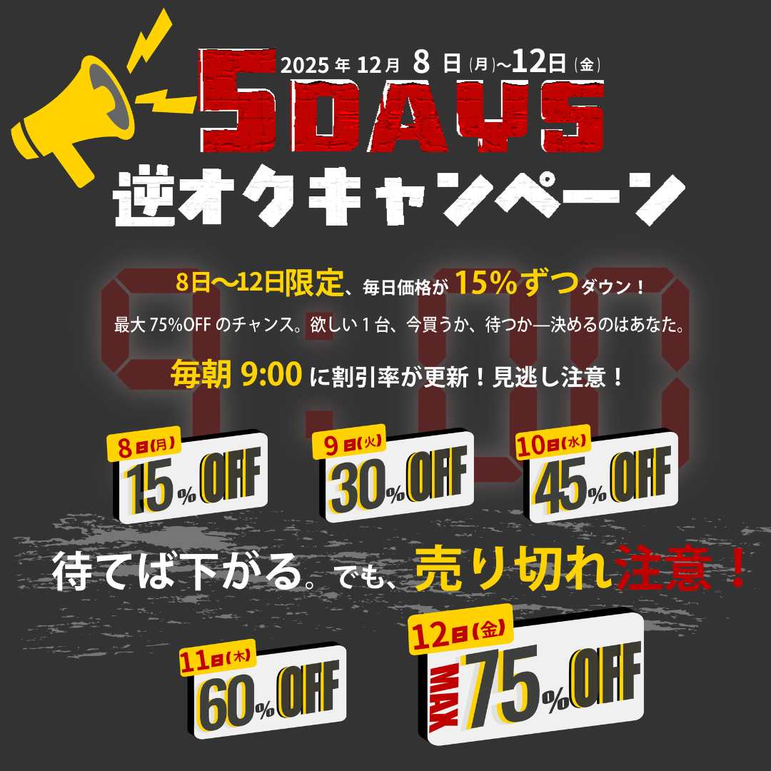 このキャンペーンは「逆オークション形式」とされ、価格が上がる通常のオークションとは逆に、毎日9時に割引率が15ポイントずつ増加します。具体的には、12月8日15%OFF、9日30%OFF、10日45%OFF、11日60%OFF、12日75%OFFという構成です。「今買うか、より値下がりを待つか」という心理を刺激し、需要喚起を狙った施策とみられます。