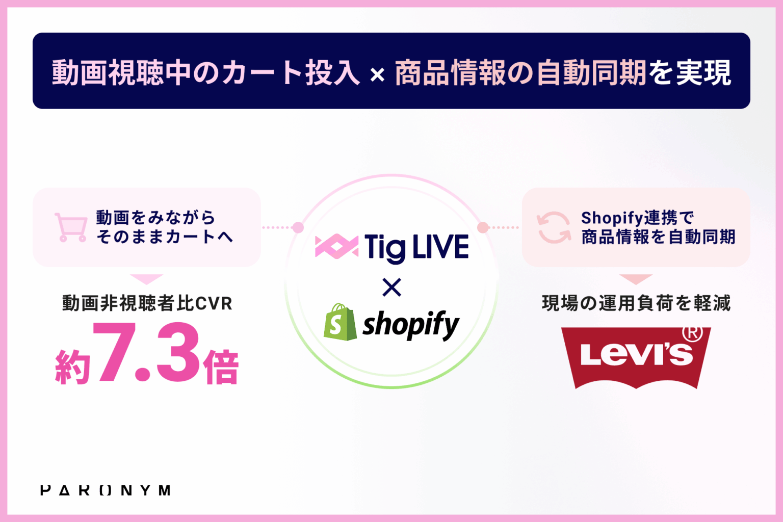 パロニムは3月26日、リーバイ・ストラウス ジャパンの公式オンラインストアにライブコマースツール「Tig LIVE」を導入し、対象施策で動画視聴者のCVR(購入率)が1.09%となり、非視聴者の0.15%に対して約7.3倍だったと明らかにしました。
