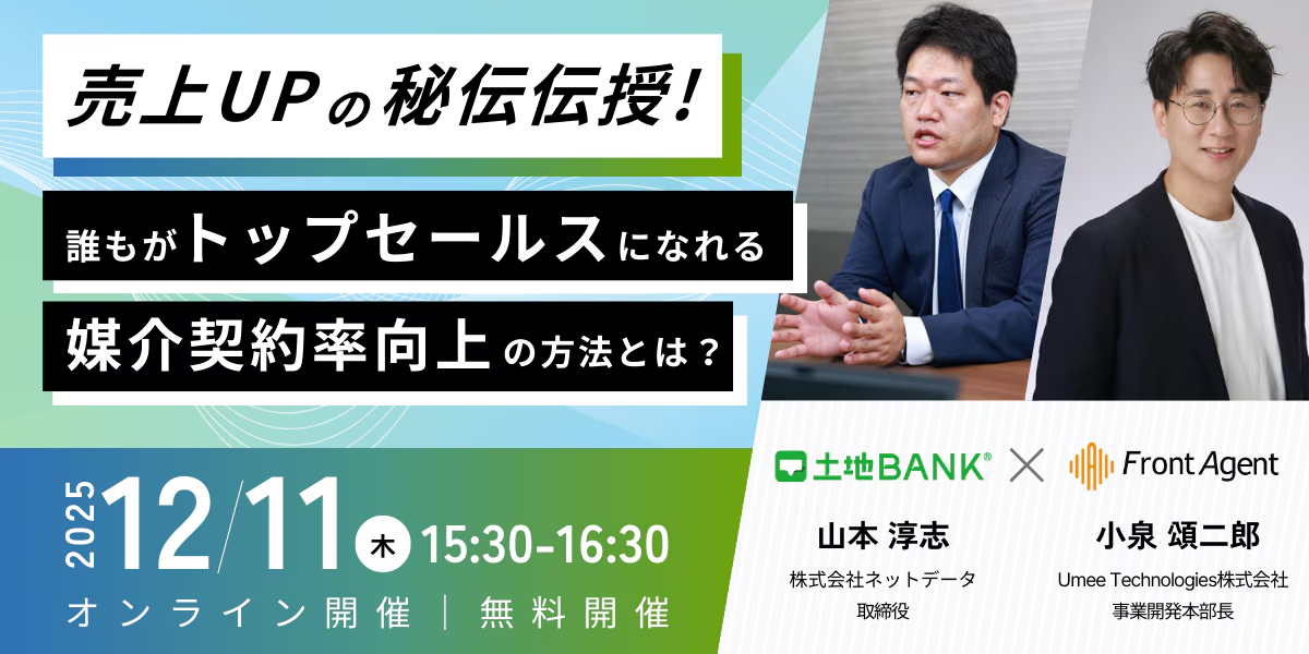 不動産の媒介契約率向上をテーマにした無料ウェビナーが、12月11日(木)15:30〜16:30にオンライン(Zoom)で開催されます。主催はUmee Technologies、共催はネットデータ。所要60分、参加費は無料で、申込は開始直前まで受け付けます。対象は経営者・マネージャー・営業担当者などです。
