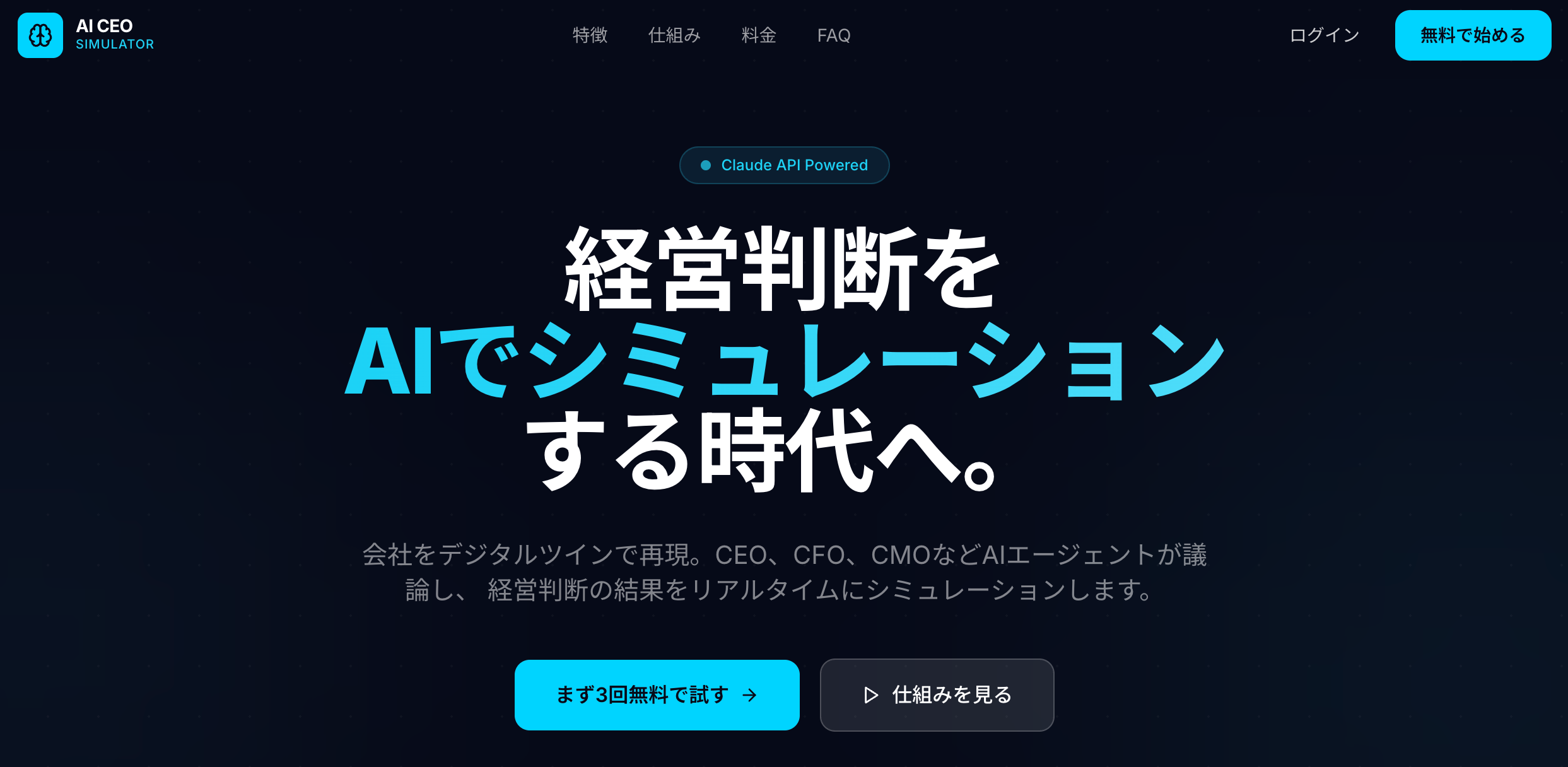 同サービスは、CEO・CFO・CMO・CTO・顧客・競合・投資家など最大7体のAIエージェントが同時に議論し、意思決定の選択肢を比較します。企業の状況を「デジタルツイン」として入力し、リアルタイム分析とPDFレポート出力で社内共有までつなげる設計で、Claude APIを活用します。