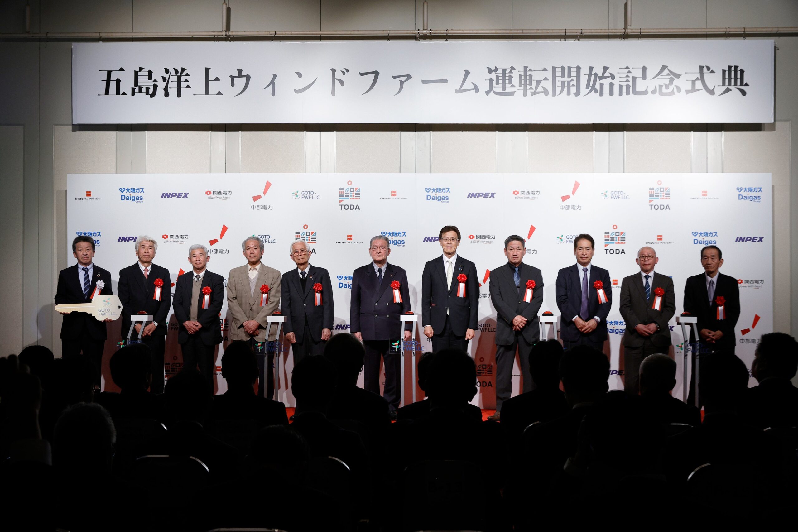 式典では鍵渡しや運転開始ボタンの押下などのセレモニーを実施し、関係者が挨拶しました。出席者には元内閣総理大臣の岸田文雄氏、環境大臣の石原宏高氏、経済産業副大臣の井野俊郎氏、国土交通大臣政務官の永井学氏、長崎県知事の大石賢吾氏、五島市長の出口太氏、戸田建設社長の大谷清介氏らが含まれます。