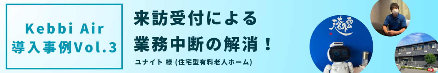 愛知県名古屋市の住宅型有料老人ホーム「ユナイト」が、AIコミュニケーションロボット「Kebbi Air(ケビィエア)」を受付に導入し、来訪者対応の多くを自動化しました。これにより、職員が介護業務を中断して玄関まで走る負担がほぼゼロに近い水準まで減り、利用者ケアに集中できる時間が大幅に増えたとしています。