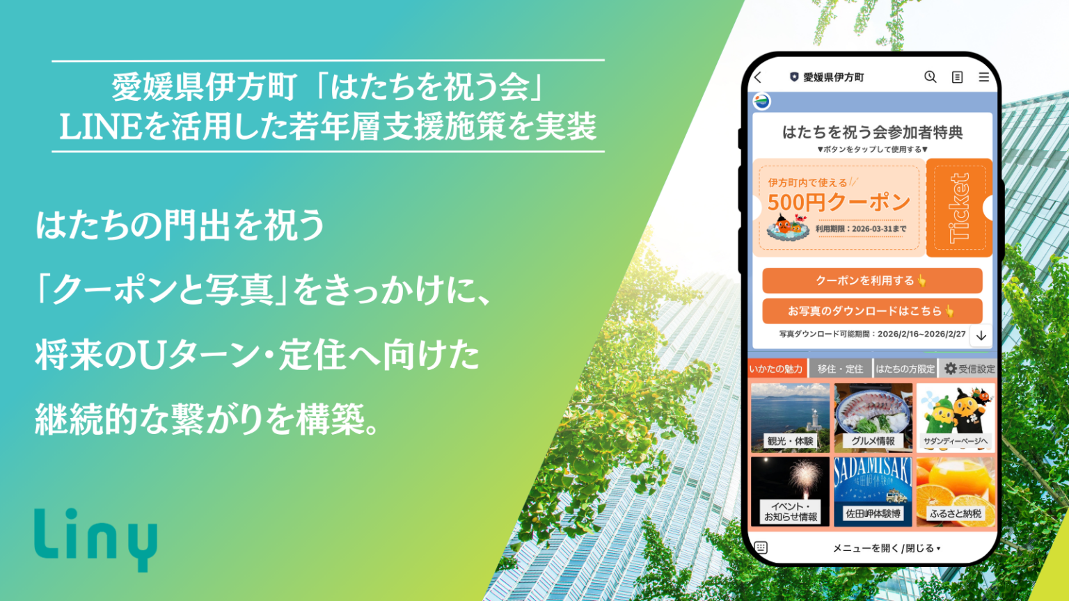 愛媛県伊方町は2026年2月20日、町の「はたちを祝う会」参加者を対象に、伊方町LINE公式アカウント(LINE ID:@ikata)でアンケートを実施し、期間限定特典を配信する取り組みを始めました。アンケート後、式典写真の配信と町内施設で使えるデジタルクーポンを提供します。