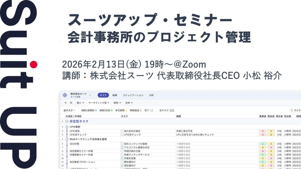 株式会社スーツ(東京都千代田区)は、オンラインセミナー「会計事務所のプロジェクト管理」を2026年2月13日19時00分~19時45分に無料開催します。講師は代表取締役社長CEOの小松裕介氏で、講演30分、質疑応答15分の構成です。
