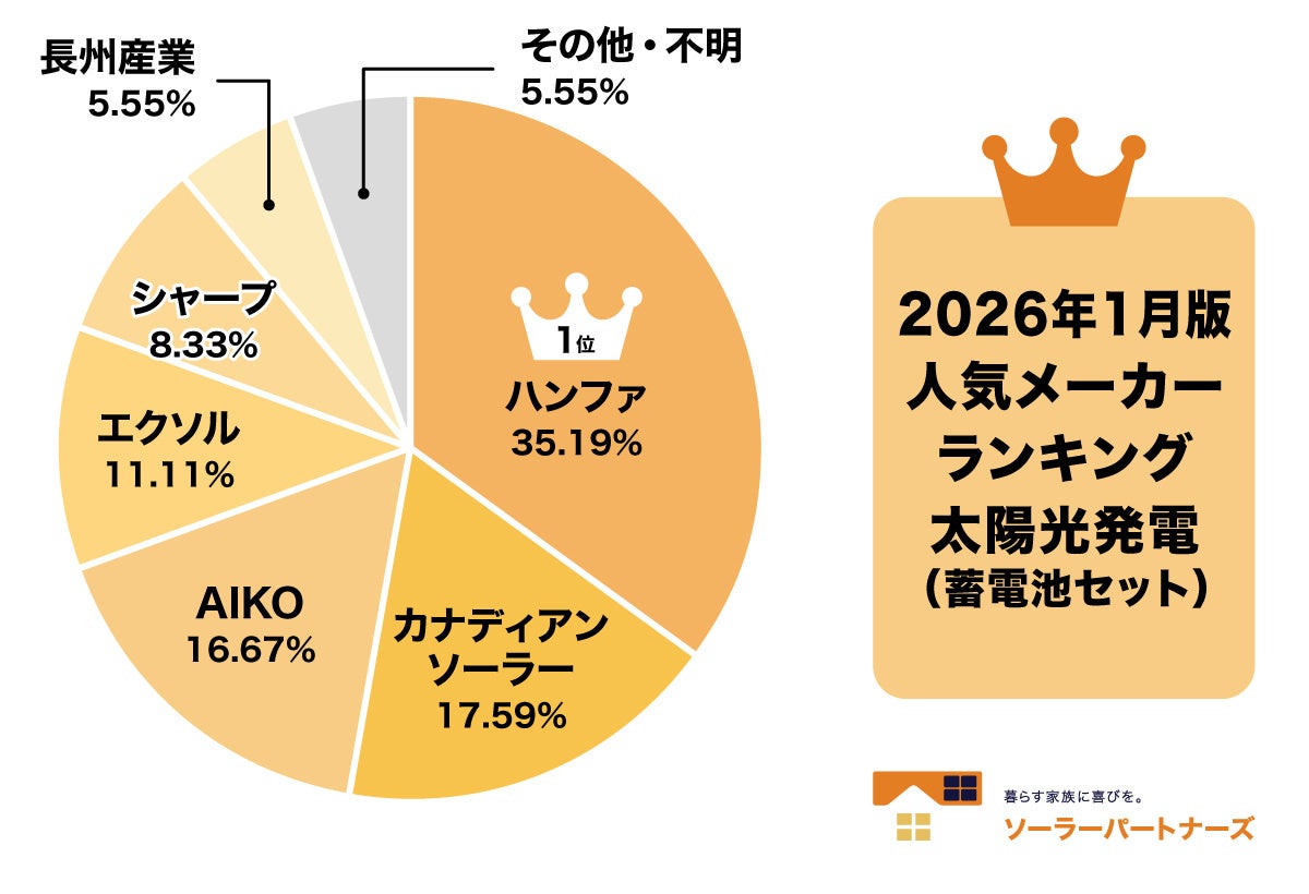 ソーラーパートナーズ(東京都新宿区)は3月26日、利用者の工事契約データを基にした「2026年1月の住宅用太陽光発電の人気メーカーランキング」を公表しました。集計は2026年1月中に工事契約に至った案件から無作為抽出した150件で、1位はハンファジャパンの35.1%でした。