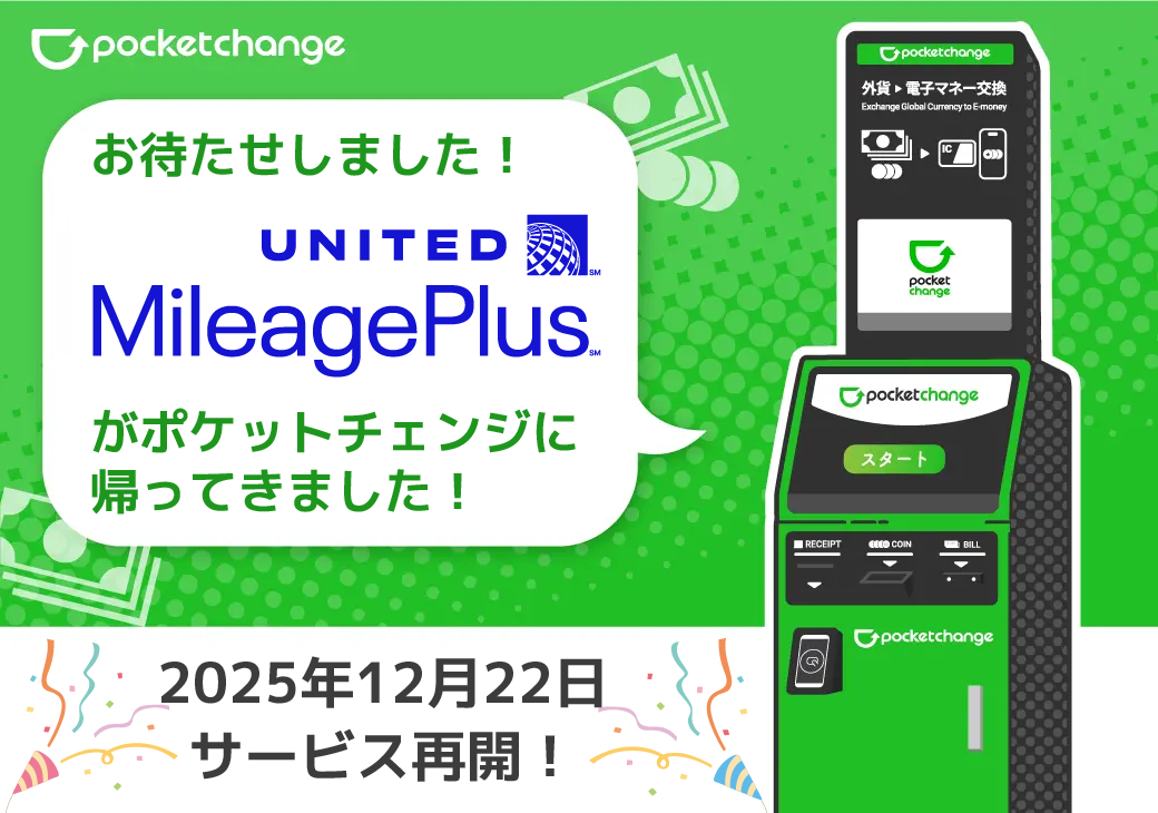 ポケットチェンジは12月22日、外貨の硬貨・紙幣をユナイテッド航空のマイレージプログラム「マイレージプラス」のマイルへ交換できるサービスを再開しました。新たなAPI連携で復活し、前回終了(2024年11月)から約1年半ぶりです。発行率は交換レート適用後の金額(USD)を基に「0.25ドル=10マイル」です。