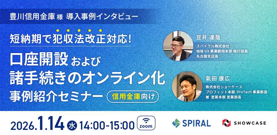 スパイラルとショーケースは2026年1月14日14時から、信用金庫向けオンラインセミナーを共催します。定員は100人、参加費は無料で、Zoomで開催します。豊川信用金庫が「SPIRAL」とオンライン本人確認(eKYC)「ProTech ID Checker」を連携し、口座開設などの手続きを短期間でオンライン化した事例をインタビュー動画で紹介します。