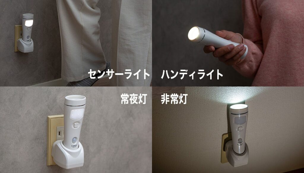 ライト本体は充電ホルダーに一体化し、AC100Vのコンセントに直挿しして運用します。モードはセンサーライト、ハンディライト(懐中電灯)、常夜灯、停電の4種類で、設定ボタンで切り替えます。モーションセンサーは検知角度110度、検知範囲2〜3mです。