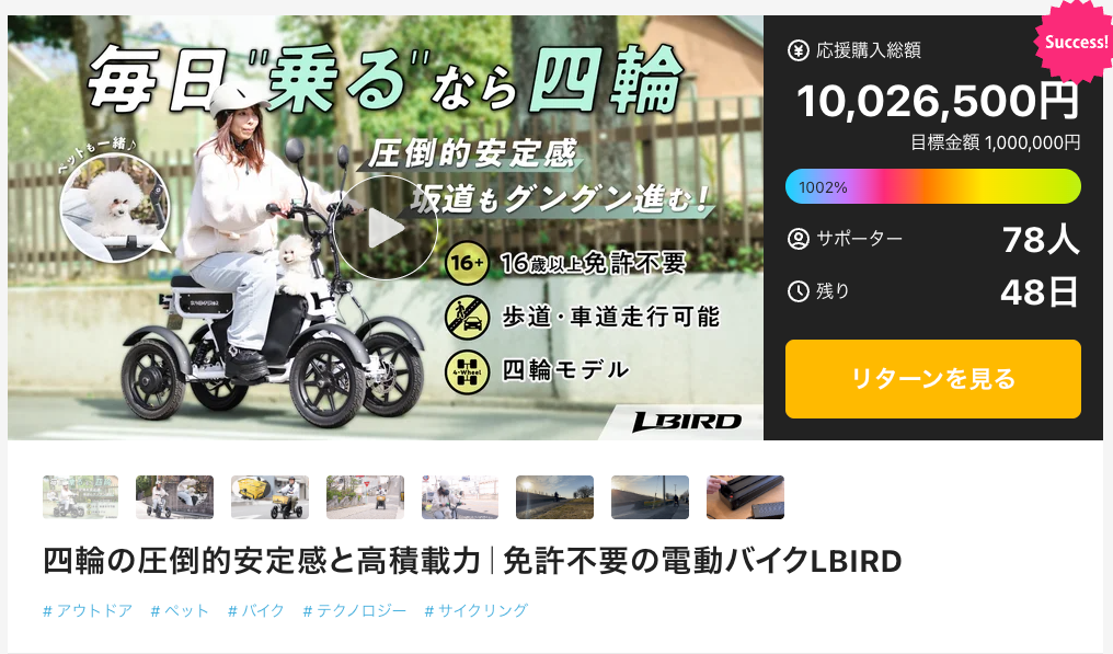Sun Emperor(有限会社龍昇)がMakuakeで先行公開した免許不要の4輪電動モビリティ「LBIRD」の応援購入総額が、2026年4月28日時点で10,026,500円に達し、1,000万円を超えました。プロジェクトは2026年4月27日に公開されています。