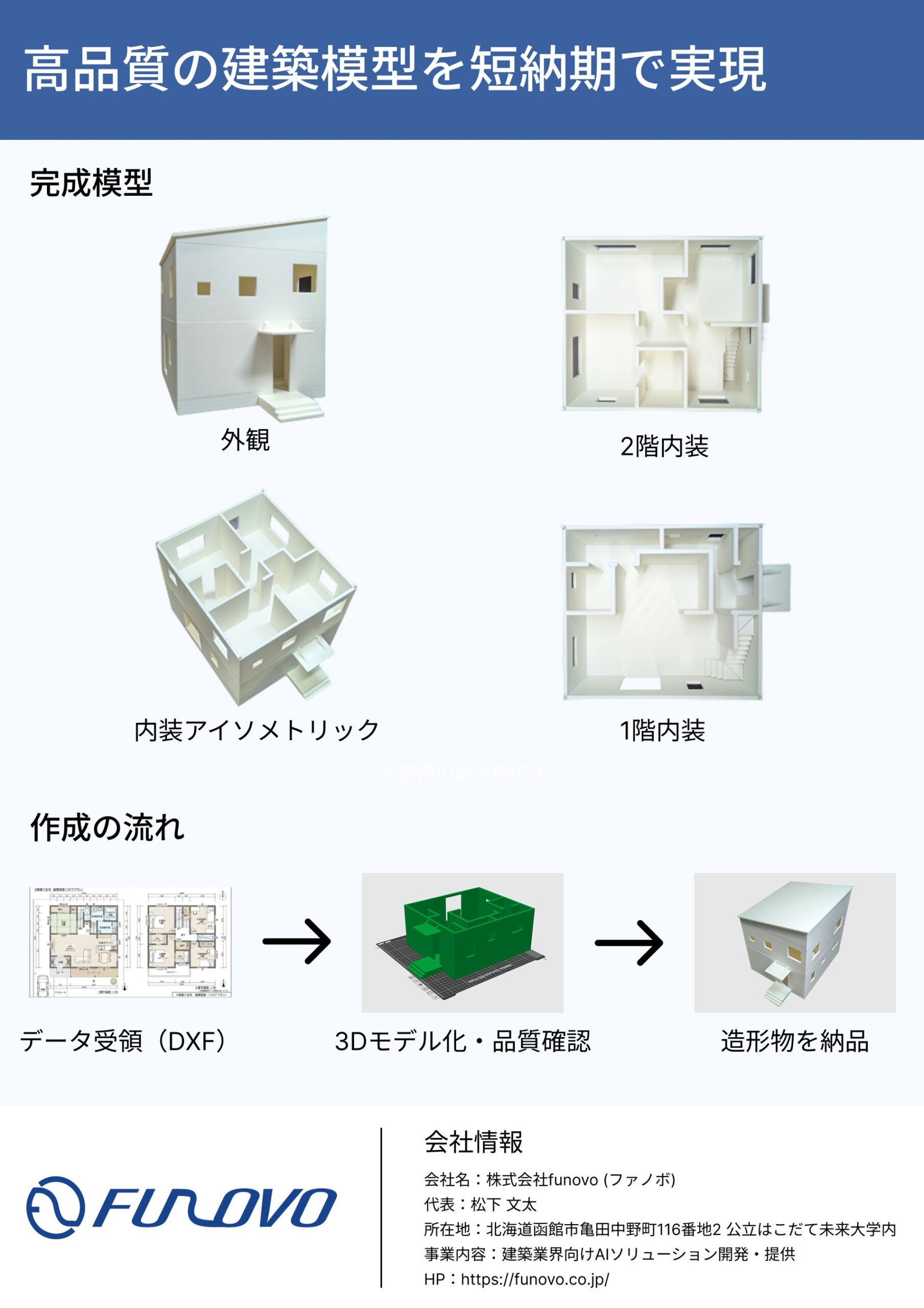 北海道函館市のfunovoは4月30日、CADデータや図面PDFから建築模型を直接3Dプリントで作成するサービス「シェイピー」を、函館市内および近郊の工務店・設計事務所向けに本格提供を始めました。価格の目安は3万5,000円からで、完全な設計図提出後の納期は1週間程度としています。