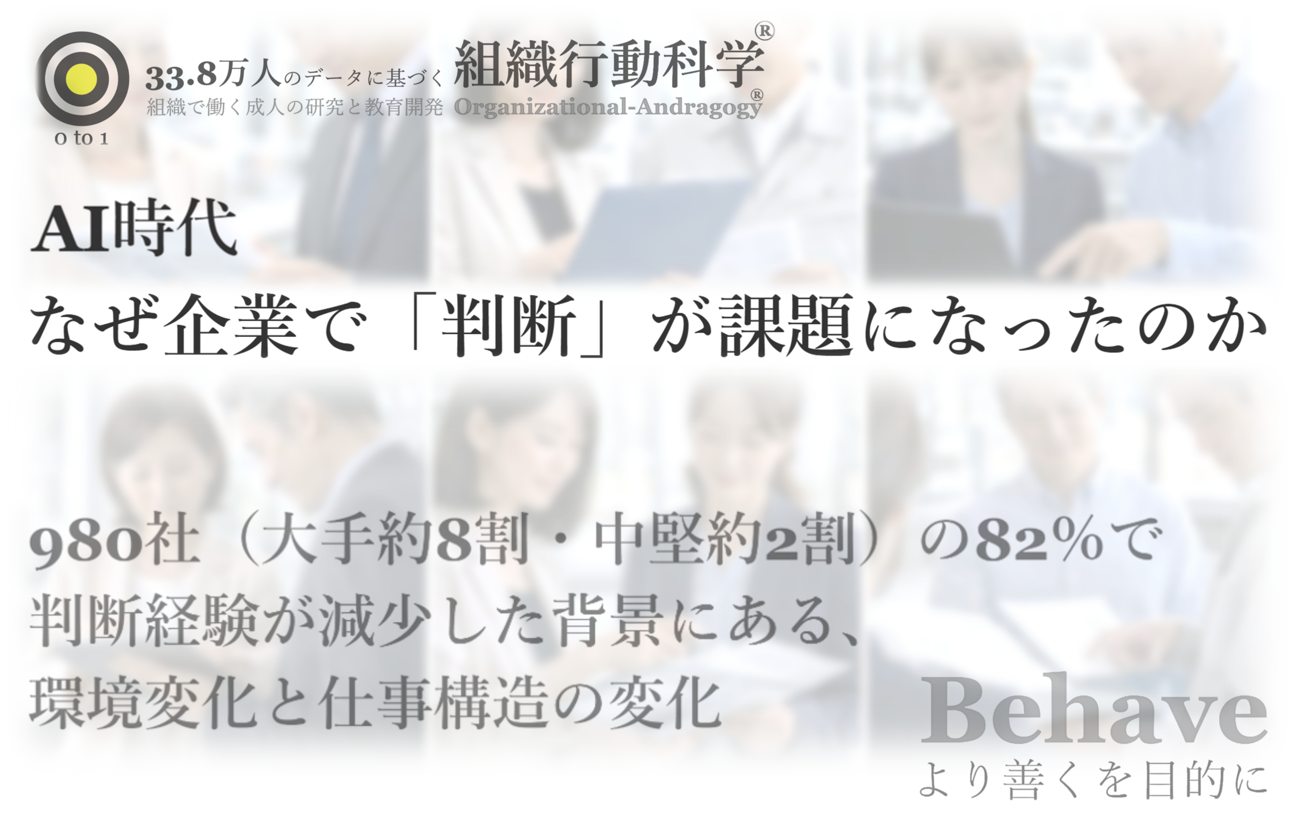 分析対象の980社は大手が約8割、中堅が約2割です。レポートでは、前例やルール整備が進むほど判断機会が減ることや、問題解決のフレームワークなどは経験を通じて使える知識であり、仕事側に判断の土台がないと現場で機能しにくい点を、組織行動科学®と経験学習の観点から整理しています。