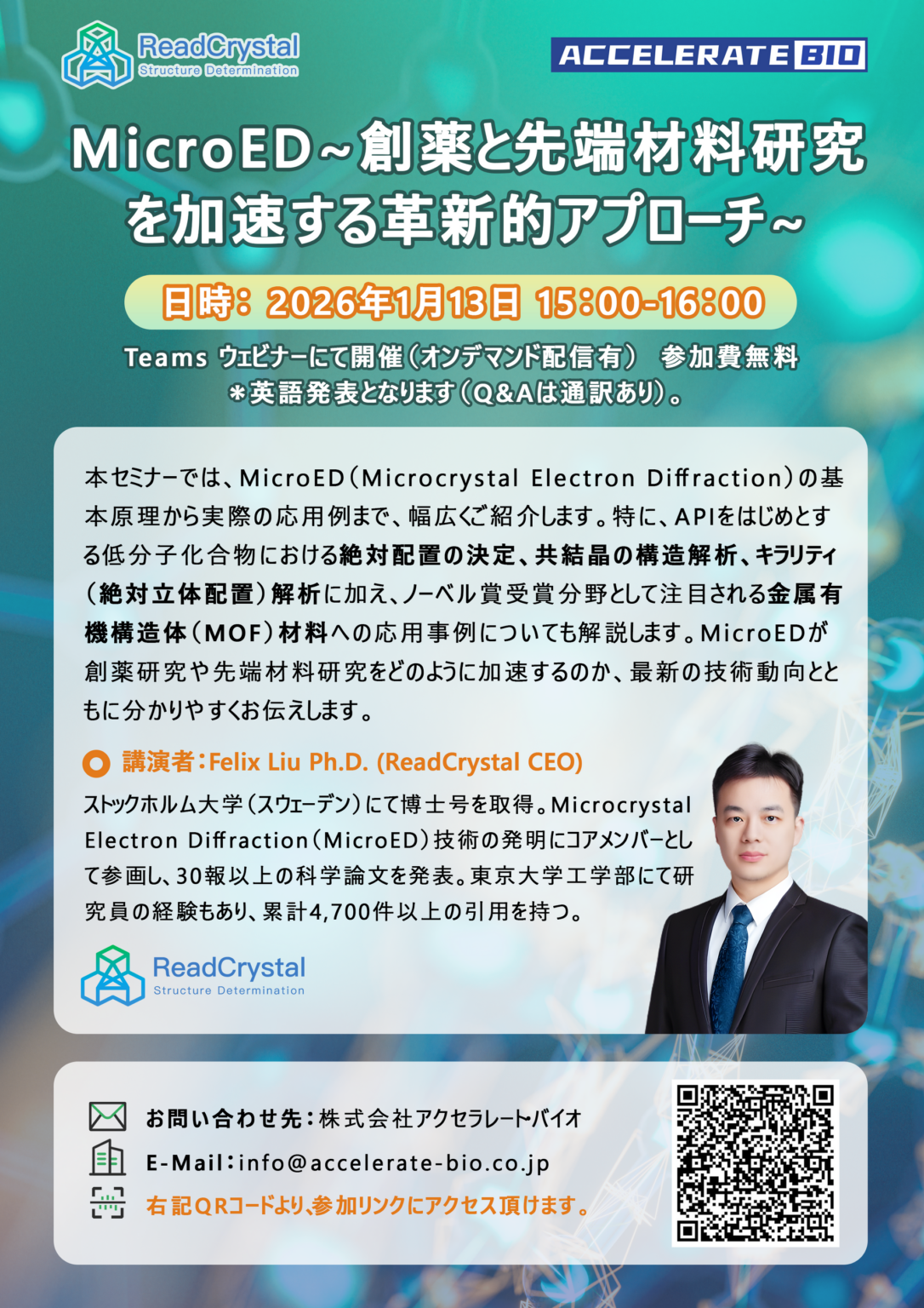 講演者は、MicroED技術の発明にコアメンバーとして関わり、30報以上の論文と累計4,700件超の引用実績を持つReadCrystal CEO、Felix Liu氏です。微小結晶・粉末・針状結晶からの構造決定で実績を持つ同社の事例紹介を通じ、MicroEDが創薬プロセスの短縮や材料開発の効率化にどこまで貢献しうるかが示される見込みです。今後は、国内研究機関での導入拡大や既存手法とのハイブリッド運用の可能性が焦点となりそうです。