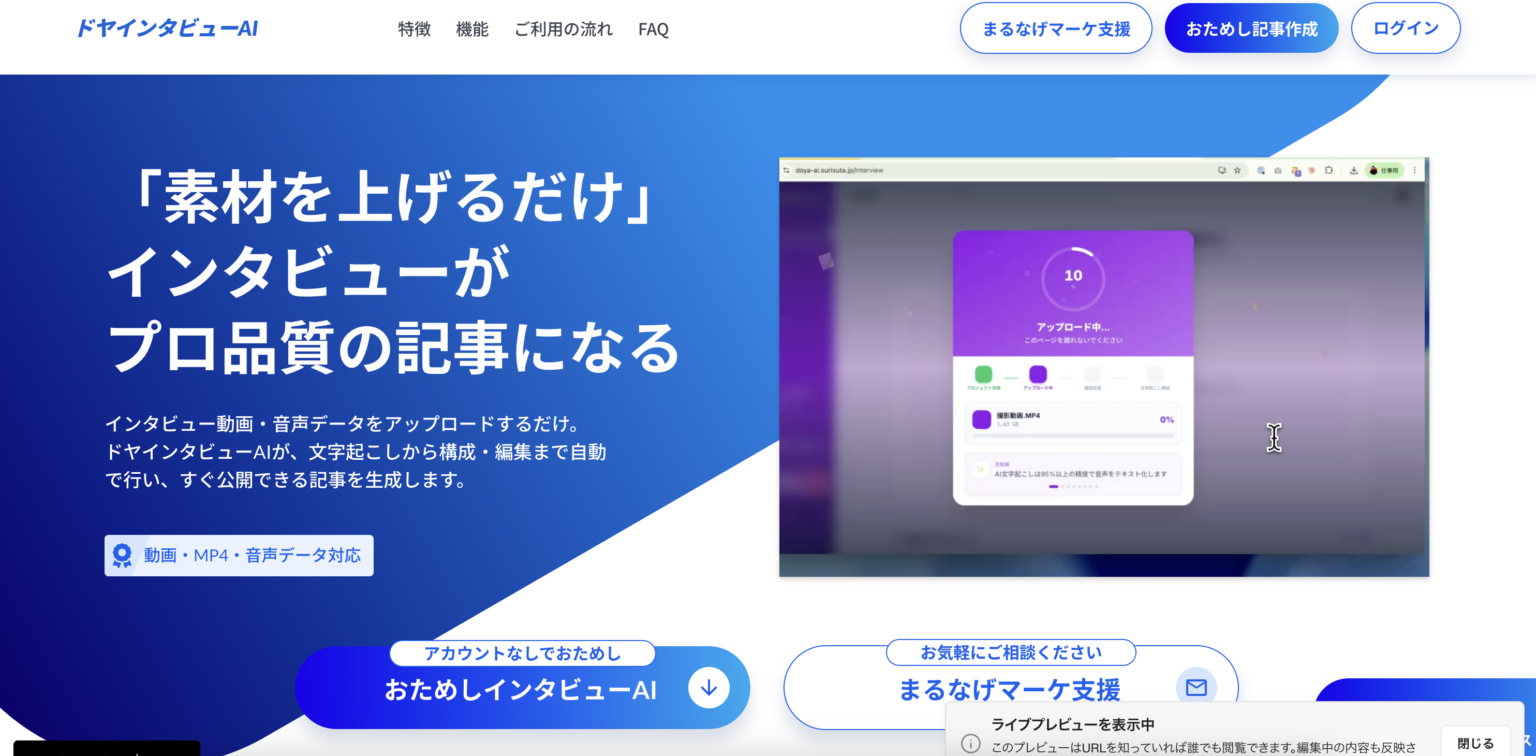 株式会社スリスタ(横浜市神奈川区)は2026年3月4日、インタビュー動画(MP4)や音声ファイルをアップロードすると、AIが文字起こしから要約、見出し作成、記事構成まで行いインタビュー記事を作成する「ドヤインタビューAI」をリリースしました。アカウント登録不要で無料のおためし利用が可能です。