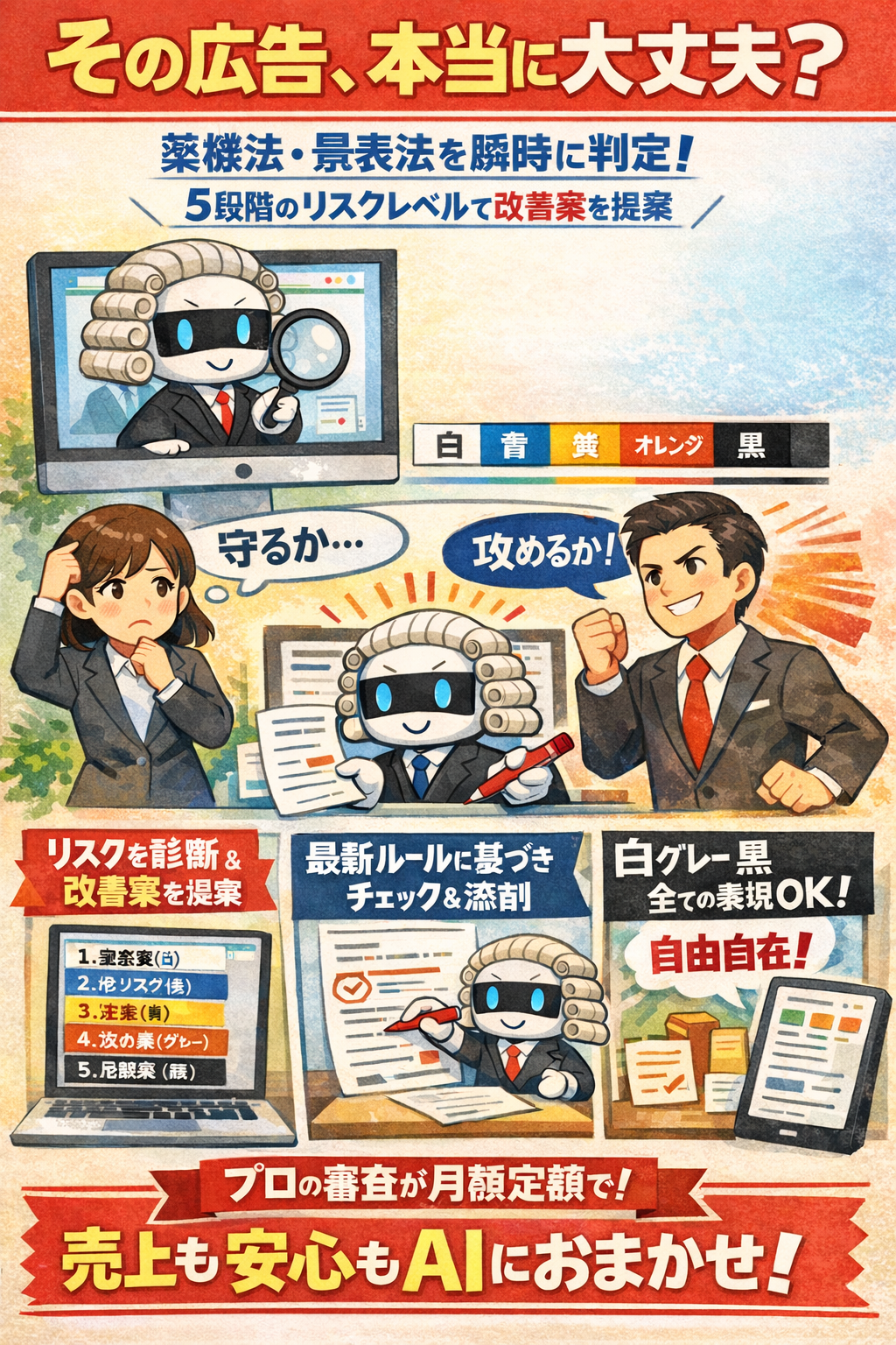 Legal AI株式会社(東京都、代表取締役・渡部薫)は、医療・健康分野の広告文やLP、販促資料を対象に、薬機法や景品表示法などのリスク箇所をAIで抽出し、スコアと警告レベルを示したうえで書き換え案まで提示する新サービス「AIリーガルチェック」の提供を始めました。リスク基準は5段階で、弁護士レベル相当の「白」から「黒」までを用意します。