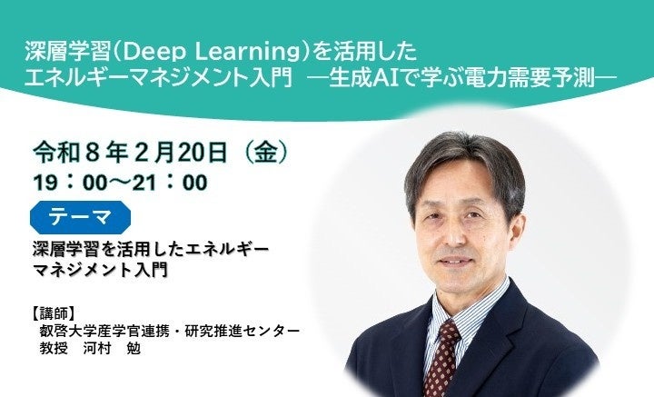 叡啓大学(広島市中区)は、深層学習を使ったエネルギーマネジメントと電力需要予測を学ぶ公開講座を2026年2月20日19時〜21時に開き、受講者30人を先着で募集します。受講料は対面3,000円、オンラインは無料です。