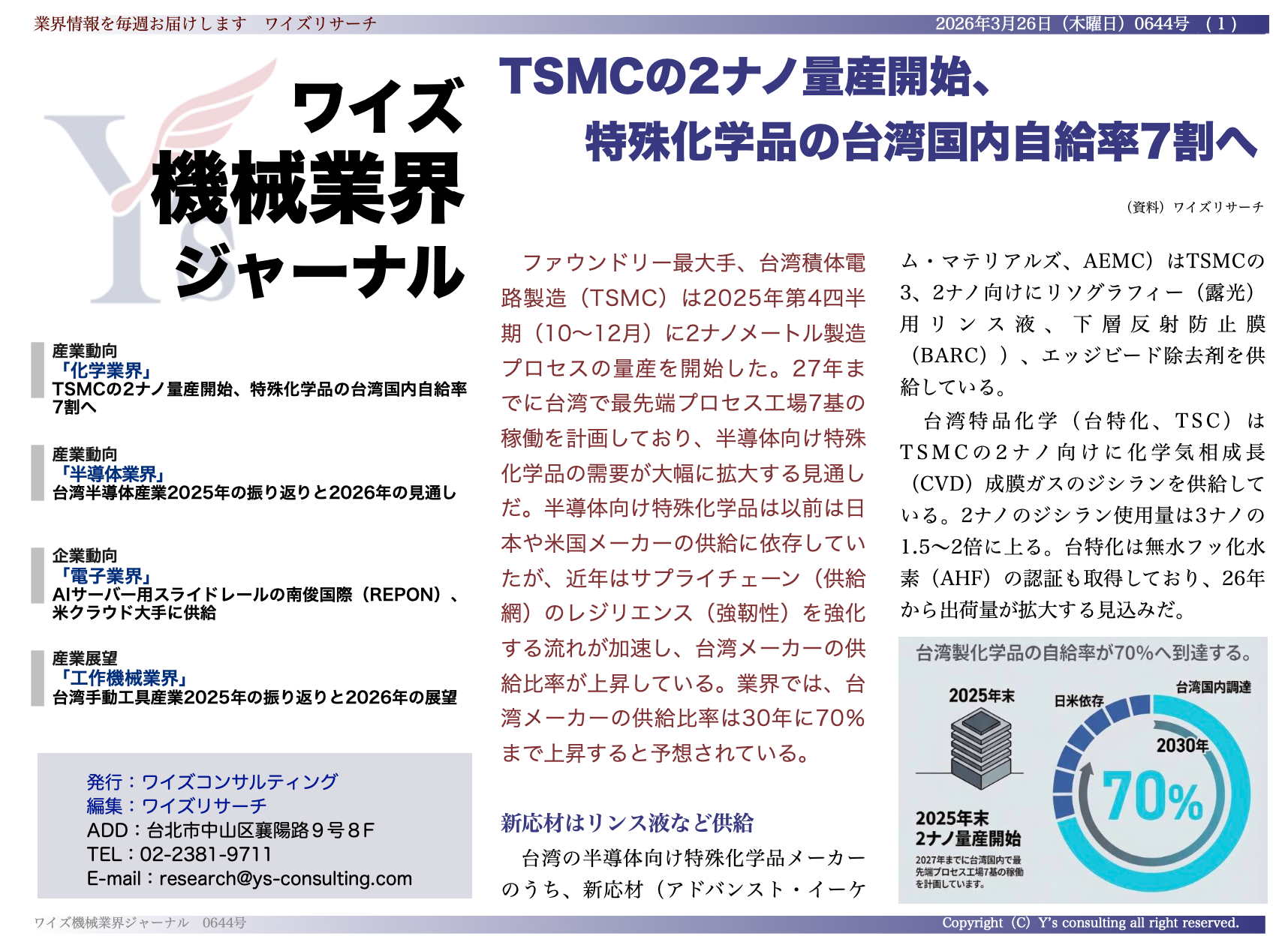ワイズコンサルティンググループ(台北市、吉本康志代表)は3月26日、台湾機械業界専門誌「ワイズ機械業界ジャーナル」2026年3月第4週号(0644号)を発行し、巻頭で「特殊化学品の台湾国内自給率7割へ」など電子・半導体・AIサーバー関連の最新動向分析を公開しました。分析では、TSMCの2ナノ量産が2025年第4四半期に始まり、2027年までに最先端プロセス工場7基の稼働計画がある点を挙げています。