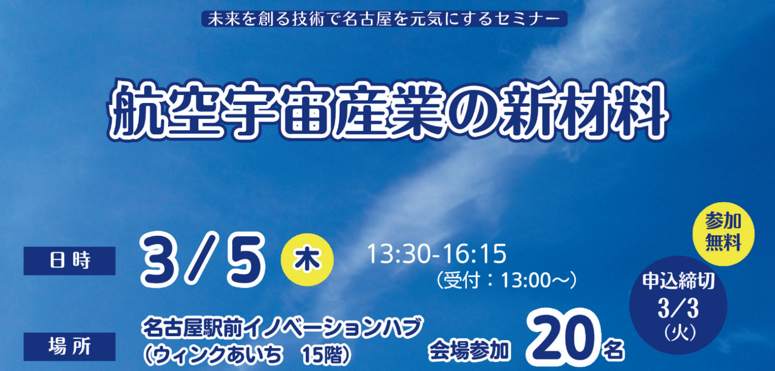 公益財団法人名古屋産業振興公社と名古屋市は、航空宇宙産業向けセミナー「航空宇宙産業の新材料」を2026年3月5日13時30分~16時15分に名古屋駅前イノベーションハブ(ウィンクあいち15階)で開きます。定員は20名、参加費は無料で、申込締切は3月3日です。