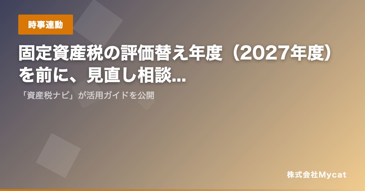 株式会社Mycat(東京都目黒区)は2026年3月26日、AI固定資産税シミュレーターサービス「資産税ナビ」で、2027年度(令和9年度)の固定資産税評価替えに向けた活用ガイドを公開しました。固定資産税の評価額は3年に1度の評価替えで見直されます。