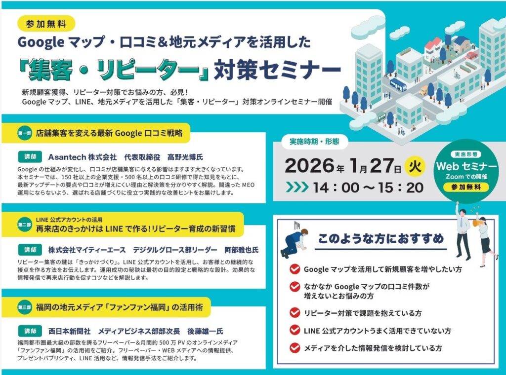 Asantech株式会社(東京都台東区)は2026年1月27日14時から、株式会社西日本新聞社、株式会社マイティーエースと共同で、地域ビジネス向けの無料オンラインセミナー「集客・リピーター対策セミナー」を開きます。Zoomで実施し、所要時間は80分です。テーマはGoogleマップの口コミを軸にしたMEO対策、LINE公式アカウント活用、地元メディア露出の3本立てです。
