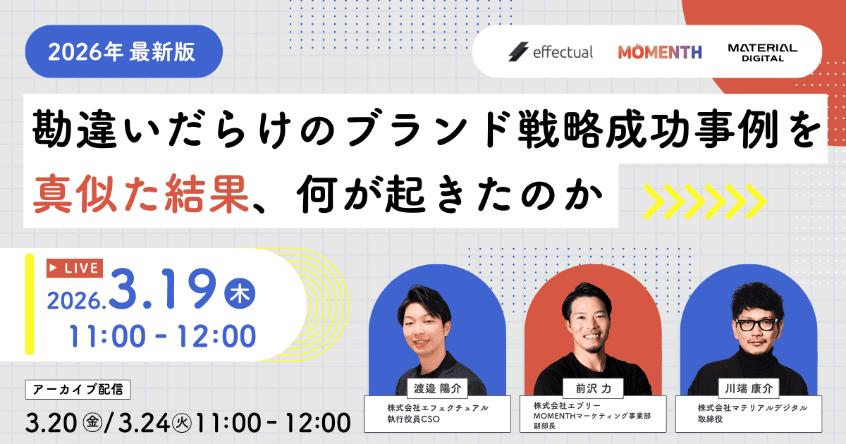 株式会社エフェクチュアル(東京都港区)は、事業成長とブランド戦略の関係をテーマにしたオンラインウェビナーを2026年3月19日(木)に開きます。参加費は無料で、事前登録制です。共催は同社のほか、マテリアルデジタル、エブリーの3社です。